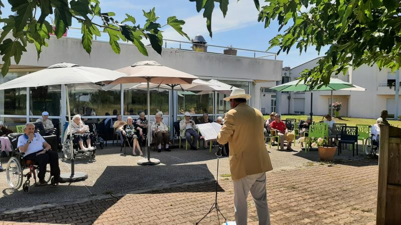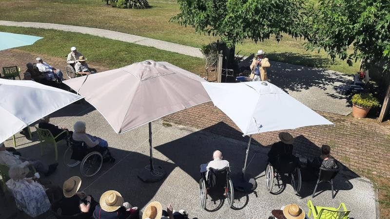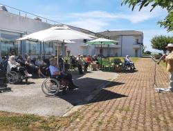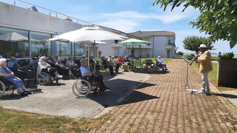 Un musicien, des spectateurs, un jardin et voila un concert de plus à la Résidence LA PRESQU'ILE. Ce 14 aout, la météo est clémente à Fouras pour que le récital se fasse en extérieur, COVID oblige.