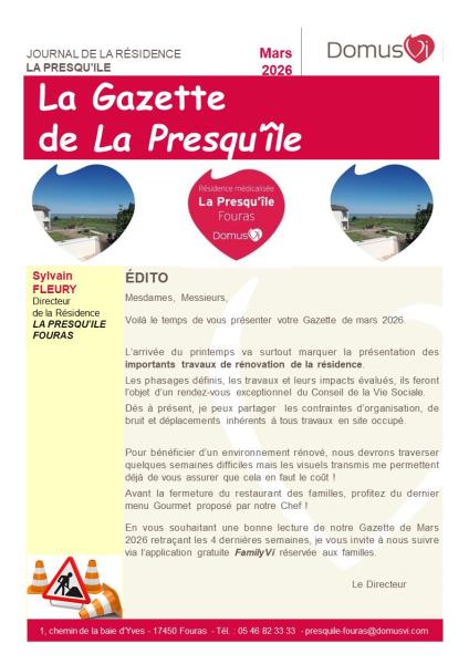 Le mois de février se termine, votre prochain numéro mensuel de votre Gazette se finalise. Vous retrouverez dés ce soir le journal interne d l’établissement sur le site internet, via l'application FamilyVi et à votre disposition au comptoir.