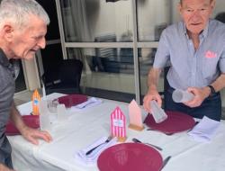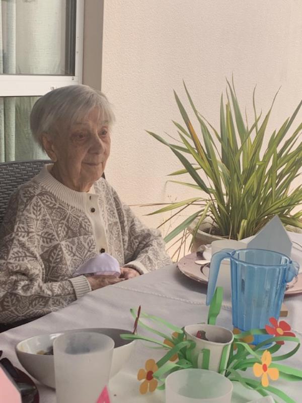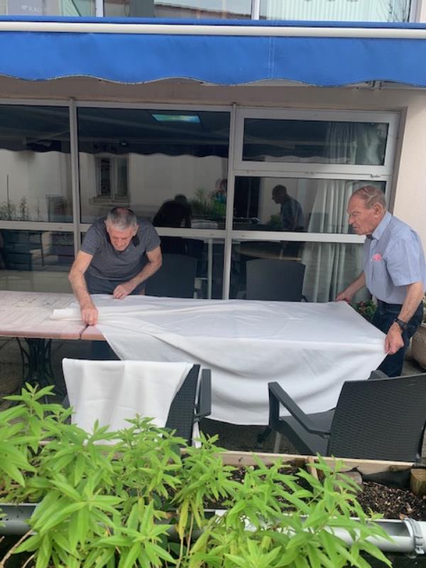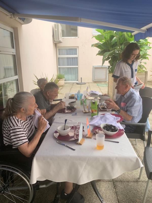 12 septembre, tout le monde affaire dans l'unité sécurisante pour proposer une jolie table pour le repas thérapeutique partagé. Sous le store du patio, le plaisir de partager le déjeuner.