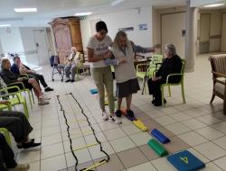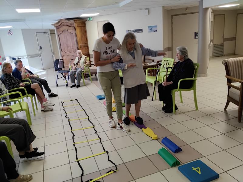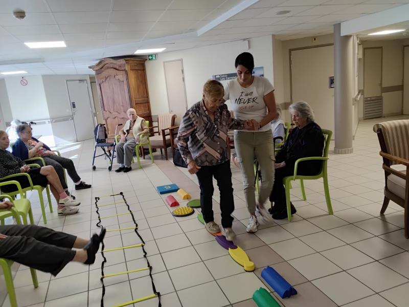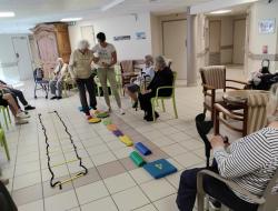 Résidence de la Presqu'Île > Actualités > en équilibre en équilibre Publiée le 07/10/2025 Le maintien de l’autonomie c'est d'abord le maintien et le travail sur les capacités physiques de chacun. Les obstacles prennent vie dans les couloirs.
