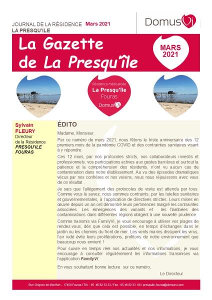 Consultable en ligne sur le site internet, par l'application FamilyVi, adressée avec la facturation mensuelle et distribuée aux résidents, la GAZETTE DE LA PRESQU'ILE fait écho à la vie dans l'établissement, les petits et les grands rendez-vous.