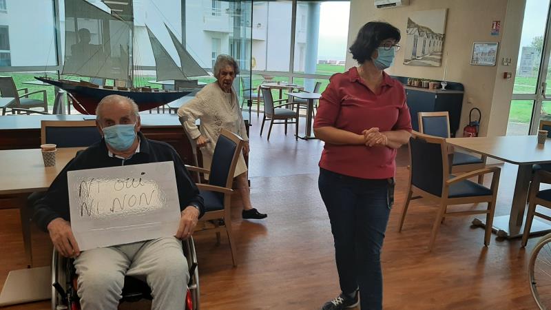 Ce 18 novembre, Catherine tente de pieger les résidents avec des parties de "NI OUI NI NON". Derrière les masques et éloignés les uns des autres pour le respect des gestes barrières, autant de difficultés qui s'ajoutent à l'exercice.