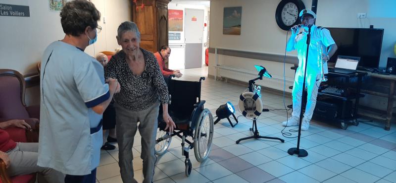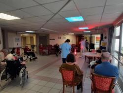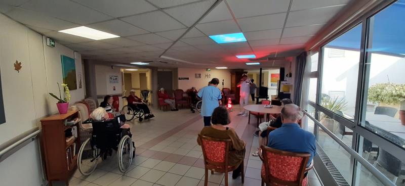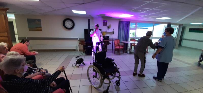 La résidence LA PRESQU'ILE termine la journée Alzheimer par un récital dans son Unité Spécialisée. Le costume immaculé de Vincent dans son spectacle Crystal Trompette fait chavirer les résidents en chansons et en Trompette !