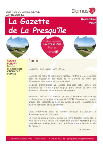 Le numéro du mois de Novembre est disponible. Sure le site internet, via l'application FamilyVi ou à disposition dans la résidence, le mensuel interne de l'établissement relaie la vie au sein de la résidence.