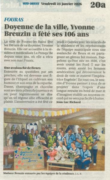 Résidence de la Presqu'Île > Actualités > La presse en parle La presse en parle Publiée le 23/01/2026 La renommée de Madame BREUZIN et ses 16 bougies dépasse les limites de la ville de Fouras. Elle s'affiche dans le Sud-Ouest du 23 janvier.