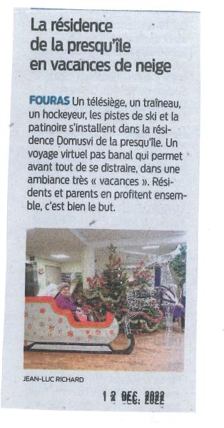 Résidence de la Presqu'Île > Actualités > La presse en parle La presse en parle Publiée le 12/12/2022 Le quotidien Sud-Ouest fait écho ce lundi matin 12 décembre de la résidence 📰 🤶.