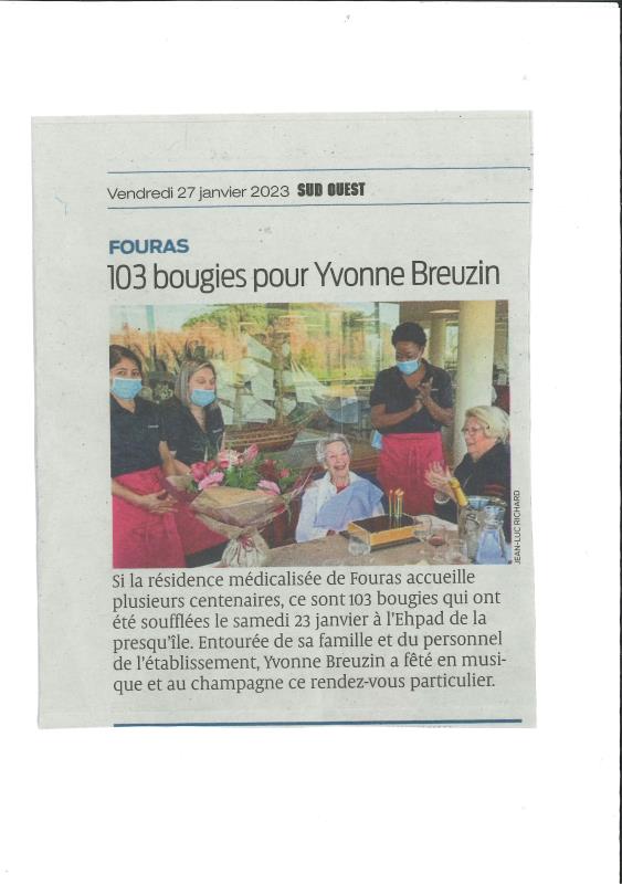 Résidence de la Presqu'Île > Actualités > La presse en parle La presse en parle Publiée le 30/01/2023 Le quotidien Sud-Ouest relaie ce 27 janvier la fête d'anniversaire 🎂 de notre aînée. 103 ans, cela vaut bien une petite coupe de champagne 🍾!