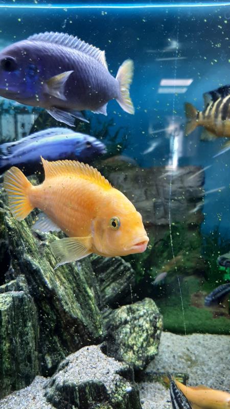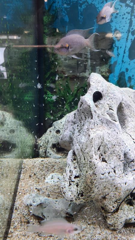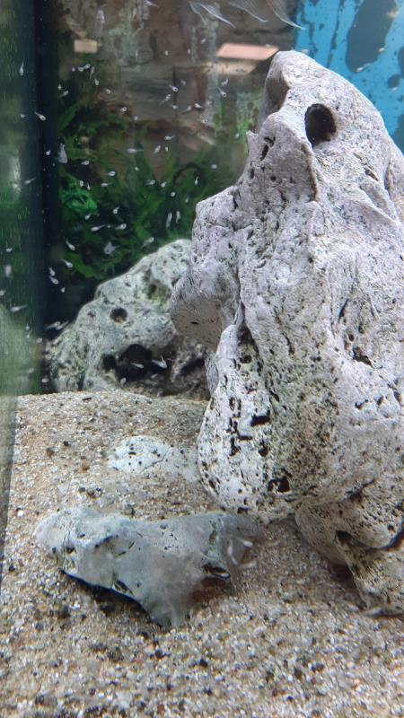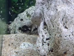 Un nuage de petits alevins a pris possession des rochers, à l'abris des autres co-locataires.