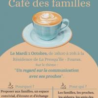 Publiée le 04/09/2024La résidence vous invite pour son Café des Familles du 1er octobre 2024. Psychologue, Psychomotricienne et Infirmière Coordinatrice de la résidence, vous proposent un temps centré sur "Un regard sur la communication avec ses proches". Familles, proches, amis, aidants... ce rendez- [...] Lire la suite