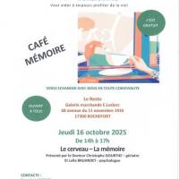 Publiée le 09/10/2025Les équipes de la résidence vous partage le CAFE MEMOIRE proposé par nos partenaires. Le rendez-vous, gratuit et ouvert à tous, est prévu le 16 octobre, de 14h à 17h dans "Le resto" dans la galerie marchande E. Leclerc de Rochefort. Lire la suite