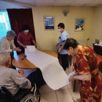 Publiée le 01/09/2020La préparation des lettrages pour le message prévu dans le jardin pour le passage des hélicos du Tour de France se finalise. Catherine et les résidents tracent et découpent le message choisi. Lire la suite