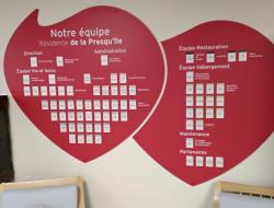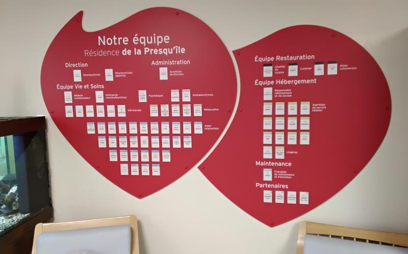 Il fallait bien reservé tout un mur pour lister l'ensemble de l'équipe de la résidence. Vous ne pouvez pas raté les 2 Coeurs Organigramme dans l'espace d'accueil. Vous y retrouverez vos interlocuteurs par fonctions et spécialités.