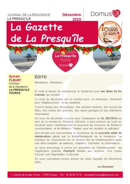 Résidence de la Presqu'Île > Actualités > un peu de patience .... un peu de patience .... Publiée le 26/11/2025 Votre numéro de Décembre est presque prêt. Retrouvez le rapidement sur le site internet, via l'application FamilyVi et sur le comptoir de la résidence.