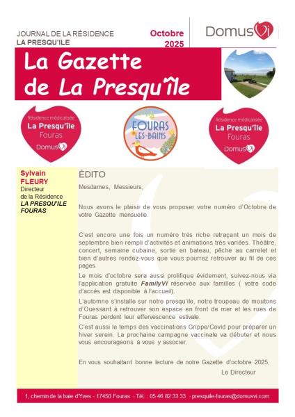 Il est déjà temps de retrouver votre nouveau numéro de la Gazette de La Presqu'Ile. Consultable sur le site internet, sur l’application FamilyVi ou à votre disposition à l'accueil de la résidence, votre journal interne retrace les activités et animations du mois de septembre et annonce celles à venir.